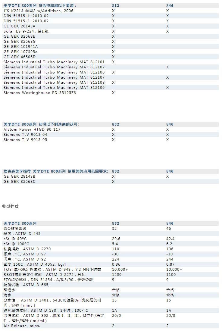 Mobil DTE 800 Series (美孚DTE 800系列) 优异性能透平机润滑油 产品简介 Mobil DTE 800 Series. 美孚DTE 832和846是性能优越的透平机润滑油,专供在最严苛的工作条件下运作的蒸汽透平机、燃气透平机和联合循环燃气透平机等 使用。 这些不断改进的产品是以具有卓越的抗热及氧化性的高质量加氢精炼基础油,加上精选的添加剂调制而成。可满足严苛工作条件 下的燃气透平机对积炭控制及“保持清洁”性能的要求;也可满足蒸汽透平机所要求的优异的分水性。配方中还含有无锌抗磨损添加剂,可满足含齿轮透平机的承重要求。 除了满足现代蒸汽透平机和燃气透平机各自的要求外,美孚DTE 800系列也是只能采用一种润滑油供燃气和蒸汽透平机同时运行 的联合循环透平机的首选用油。可以同时满足积炭控制和分水性能要求,正是这种先进的润滑油技术所具有杰出的主要性能。美孚DTE 832和846所具有的优异抗热/氧化性,确保它们能够在最严苛的透平机环境中工作。 美孚DTE 800系列油品的工作特性,体现在保护设备的表现优异、运作可靠等方面。使设备停机时间减少、换油周期延长等。 这些产品最终让用户能更灵活地选择设备,因为它们可供所有类型-蒸汽、燃气、含齿轮-的透平机使用。 特性与优点 美孚DTE品牌矿物油基产品是举世透平机用户的必选用油,已有百多年之久。在此期间,本公司的科学家们与透平机设备制造商及用户保持紧密联系,确保本公司的润滑油能够满足或超越透平机新设计的要求。因此,本公司就必需不断提高美孚透平机润滑油的性能,采纳最适当的新型基础油和添加剂技术。 对於输出功率高的新型固定式燃气透平机而言,卓越的热稳定性/防止热降解以控制沉积等性能是关键的要求。严苛的工作状态使润滑油承受热应力,造成滤油器堵塞、伺服阀门产生沉积,或使油品寿命缩短等情况。对於新型的蒸汽透平机,除了需要较强的抗氧化能力外,当发生蒸汽泄漏的情况时,也需有良好的分水性。至於联合循环发电透平机,其润滑油则必需同时满足两类透平机的要求。